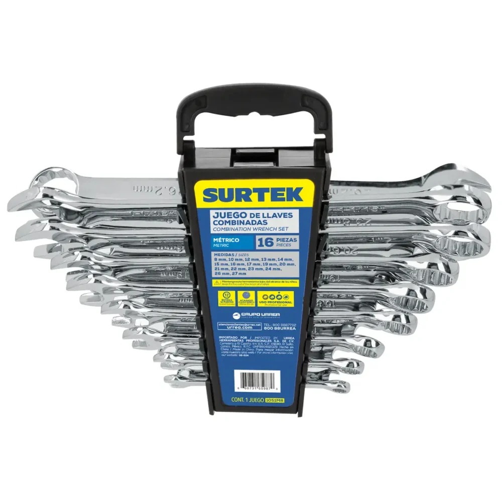 Juego de llaves combinadas pulido espejo métricas, 12 puntas, 16 piezas en rack